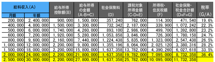 社会保険料と所得税・住民税の合計額がGの欄、Gの欄を給料収入(年)で割ったものが税率です。社会保険料、所得税・住民税共、収入が増加すると支払額が増加する為、税率は収入の増加に伴って上がっていきます。